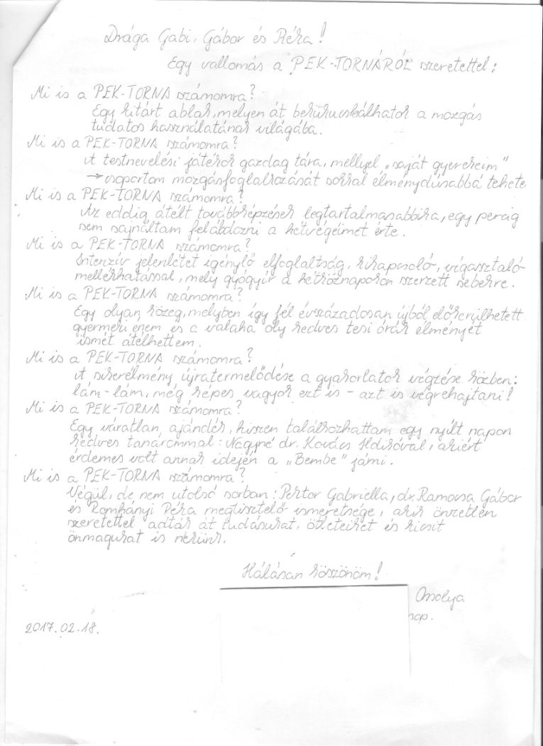 „-Az elsajátított ismeretek miként segítik majd a munkáját a 3-7 éves korosztály iskolára való felkészítésében? Az óvodai pedagógusi alkalmazásom gyógytestnevelő. Mozgás foglalkozásokon keresztül szeretném a tanultak figyelembevételével megújítani módszertani, gyakorlati eszköztáramat. Rengeteg ötletet kaptam Mit? Mivel? Hogyan? alkalmazzak. Komplex módon, hogyan tudom a rám bízott gyermekeket fejleszteni. A mozgás varázslatos, szeretném, ha az óvodai gyógytestnevelés még több felfedező tevékenységre és megtapasztalásra aktivizálná a hozzám járó gyermekeket. Mely feladatok, illetve gyakorlatok hagytak a legmélyebb nyomot a tanfolyam során Önben? A legegyszerűbb dolgokból is lehet élményszerű és tartalmas, fejlesztő eszköz. A mozgás és értelmi fejlesztés milyen nagyszerűen összekapcsolható. Tudok labdát készíteni rizsből és lufiból-nem ismertem, teljesen elvarázsolt. A sportpoharakban rejlő fejlesztő hatás lenyűgözött, szívesen elvégezném tanfolyamként. Mi a véleménye arról, hogy a megszerzett ismereteket és gyakorlatokat mikor tudja beépíteni a fejlesztő munkájába? Azonnal! A tanfolyam végeztével, a következő munkanapomon a tanultakból összeállított játék, gyakorlat listával kezdtem a munkát, olyan aktivizáló volt a képzés. Összességében mi az, amit a leghasznosabbnak tart a tanfolyamon szerzett ismeretek és gyakorlatok közül, és miért? A sok-sok „Pektor Gabi gyakorlatot”, a fáradhatatlan megújulást, az ismeretek átadását, az önzetlenséget. A tanfolyam lehetőségét viszem tovább, ajánlom meleg szívvel. Várom a következő nyílt nap lehetőségét. Köszönöm, köszönöm! „ Á. Renáta gyógytestnevelő